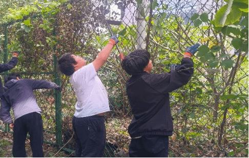 活动伊始,学生第一党支部书记莫伟豪与2025级辅导员苏炼现场进行动员,明确了任务分工与安全要求。志愿者们戴上手套,拿起工具,在党员骨干的带头下投入劳动。现场气氛热烈,“党员带头干、团员跟着上”的场面生动展现了组织的凝聚力。大家分工协作,有的负责清理根系深厚的顽固杂草,有的负责归拢搬运枯枝落叶,对卫生死角进行了彻底清理。