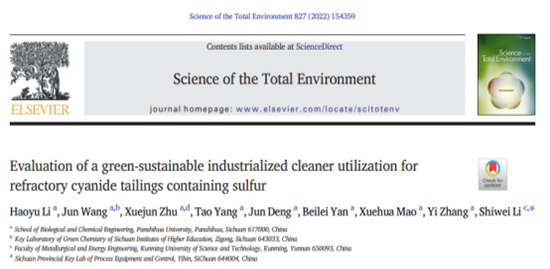 我院化工资源有效利用研究团队李浩宇博士作为第一作者,以攀枝花学院为第一单位,在环境领域国际顶级期刊《Science of the Total Environment》(中科院分区1区Top期刊,影响因子10.753)上发表题为“Evaluation of agreen-sustainable industrialized cleaner utilization for refractory cyanidetailings containing sulfur”的研究论文,该研究是我校化工资源有效利用研究团队与昆明理工大学、四川轻化工大学等单位合作在工业尾渣清洁利用方面取得的重要研究成果,获绿色催化四川省高校重点实验室开放基金、过程装备与控制工程四川省高校重点实验室开放基金、攀枝花学院博士基金资助。