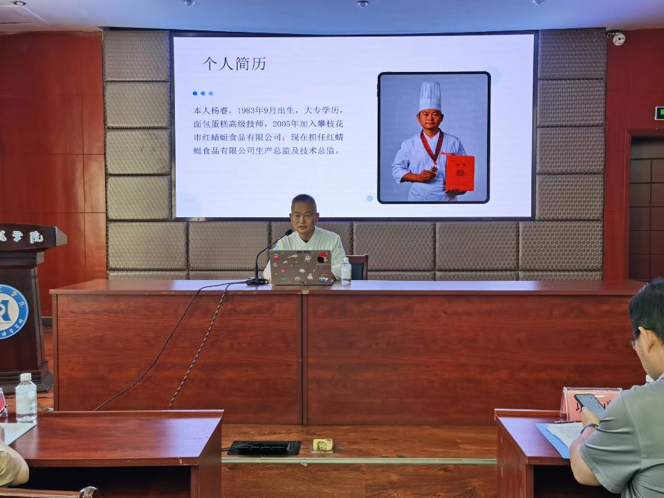 讲劳模故事环节,由四川省劳动模范、攀枝花市红蜻蜓食品有限责任公司技术总监杨睿主讲。杨睿结合自身二十年糕点设计与研发工作经历,从初入岗位时的懵懂探索,到面对技术难题时的反复攻坚,再到获得行业竞赛的金奖,用朴实无华的语言讲述了一个个真实鲜活的劳动故事。他表示,“二十年可以做很多事,但在一个行业深耕二十年,需要热爱和坚持,正是这份热爱和坚持,才能让一个默默无闻的手艺人被更多人看到,站上省劳模的领奖台。” 他还结合生化、农业领域的专业特点,鼓励同学们珍惜在校学习时光,将理论知识与实践操作紧密结合,未来在专业领域深耕细作,用劳动创造价值,用奋斗实现梦想。