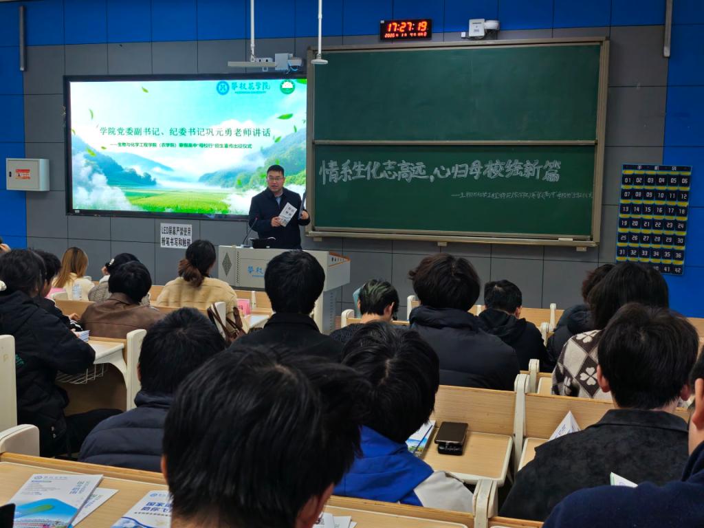 为号召学生于寒假期间返回高中母校,交流大学学习生活心得,宣传我校办学成果,在母校与大学之间有效构建情感联结与信息沟通的桥梁。2025年1月4日,我院于志学楼1-116教室隆重举行以“情系生化志高远,心归母校绘新篇”为主题的寒假母校行活动出征仪式。学院党委副书记、纪委书记巩元勇老师,学生科负责人兼2023级辅导员莫伟豪老师,2024级辅导员田静老师,2025级辅导员苏炼老师出席本次活动,2025级各实践小队队长及队员共同参加。