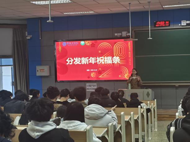 大会特别设置分发新年祝福条环节,各班班委将辅导员苏炼老师精心准备的祝福条逐一递到每位同学手中,纸条上既有对学业精进的期许、对平安顺遂的祝愿,也有对未来征程的鼓励。同学们手持祝福条相互交流、分享喜悦,字里行间的暖意驱散了冬日寒意,让整个会场充满了温馨和谐的氛围。